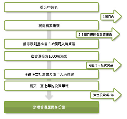 - 在取得原則批准書後的6個月內,將不少於港幣1000萬,投資在入境處指定的類別中(如金融資產項目:股票、債券、基金、投連險項目等)